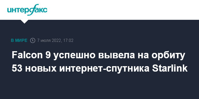 Москва. 7 июля. INTERFAX.RU - Тяжелая ракета-носитель Falcon 9 в четверг успешно вывела на орбиту очередную партию из 53 мини-спутников для пополнения орбитальной группировки глобальной сети интернет-покрытия системы Starlink. Об этом сообщила компания-разработчик SpaceX.