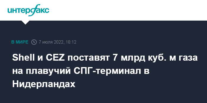 Москва. 7 июля. INTERFAX.RU - EemsEnergyTerminal – дочерняя компания Gasunie – подписала совместный контракт с Shell Western LNG и чешской СEZ на поставку 7 млрд кубометров газа на плавучий терминал в порту Эмсхавен в Нидерландах, сообщил оператор объекта.
