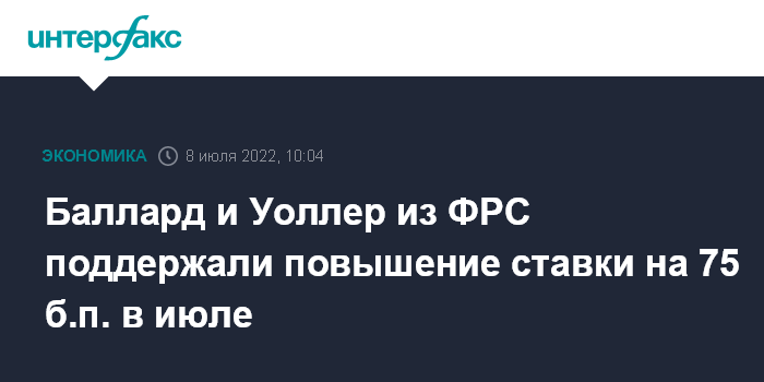 Москва. 8 июля. INTERFAX.RU - Председатель Федерального резервного банка (ФРБ) Сент-Луиса Джеймс Баллард и член совета управляющих Федрезерва Кристофер Уоллер, одни из самых "ястребиных" представителей руководства американского центробанка, высказались в поддержку повышения ключевой ставки на 75 базисных пунктов на июльском заседании, сообщает агентство Bloomberg.