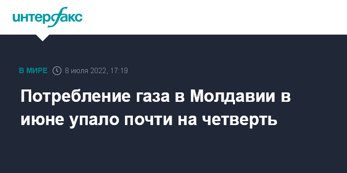 Москва. 8 июля. INTERFAX.RU - Объем потребления природного газа в Молдавии в июне 2022 года сократился на 23% по сравнению с аналогичным месяцем прошлого года и на 8,5% - по сравнению с маем текущего года, сообщила в пятницу пресс-служба АО "Молдовагаз".
