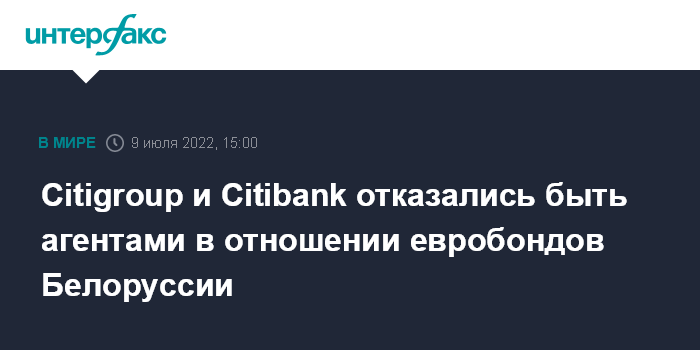 Москва. 9 июля. INTERFAX.RU - Citigroup и Citibank отказались быть агентами в отношении евробондов Белоруссии, сообщил Минфин республики.