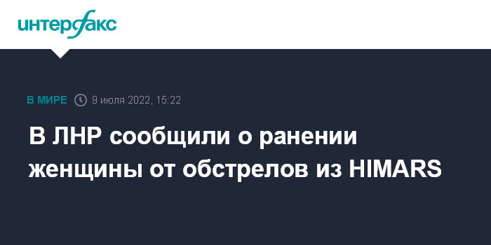 Москва. 9 июля. INTERFAX.RU - Мирная жительница пострадала в подконтрольном Луганской народной республике населенном пункте Ирмино в результате обстрела в субботу со стороны украинской армии с применением реактивных систем залпового огня (РСЗО) HIMARS американского производства, заявляют в ЛНР.