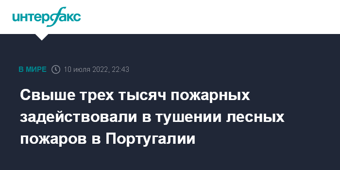 Москва. 10 июля. INTERFAX.RU - Более трех тысяч пожарных задействованы в локализации разрушительных лесных пожаров в Португалии, в результате которых пострадали около 30 человек, передает в воскресенье Associated Press (AP) со ссылкой на местные власти.