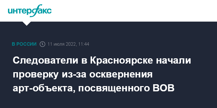 Москва. 11 июля. INTERFAX.RU - Следователи в Красноярске проводят проверку по факту осквернения арт-объекта, посвященного Великой Отечественной войне, сообщает пресс-служба главного следственного управления СКР по Красноярскому краю и Республике Хакасия в понедельник.