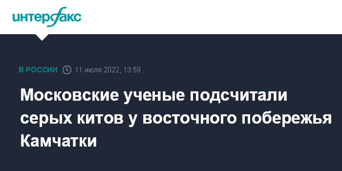 Москва. 11 июля. INTERFAX.RU - Ученые Института проблем экологии и эволюции (ИПЭЭ) РАН имени А. Н. Северцова (Москва) завершили трехнедельную экспедицию по изучению охотоморских серых китов в бухте Ольга (Кроноцкий залив ) на восточном побережье Камчатки, сообщает пресс-служба Кроноцкого государственного заповедника в понедельник.