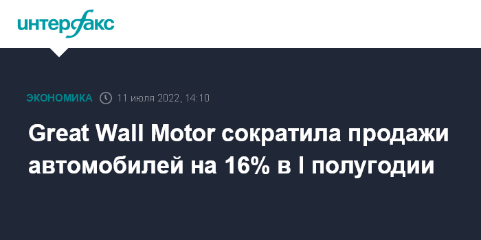 Москва. 11 июля. INTERFAX.RU - Great Wall Motor (GWM), крупнейший производитель внедорожников и пикапов в Китае, по итогам первого полугодия снизила продажи на 16% - до 518 525 машин, сообщила компания. Из них на экспорт ушло больше 62,8 тысячи автомобилей.