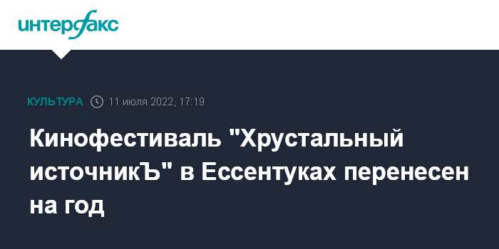 Москва. 11 июля. INTERFAX.RU - Кинофестиваль "Хрустальный источникЪ", который должен был пройти в июле в Ессентуках, перенесен на лео 2023 года из-за разногласий организаторов, сообщила мэрия города.