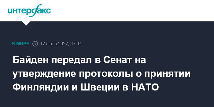 Москва. 12 июля. INTERFAX.RU - Президент США Джо Байден передал в Сенат на утверждение протоколы о принятии Финляндии и Швеции в члены НАТО.