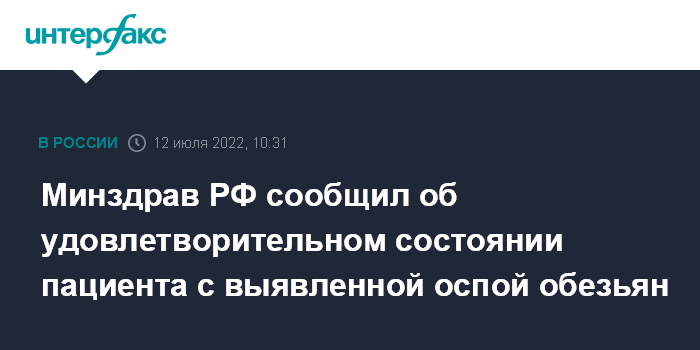 Москва. 12 июля. INTERFAX.RU - Пациент с выявленной оспой обезьян находится в удовлетворительном состоянии, ему оказывается вся необходимая помощь, сообщили в пресс-службе Минздрава России.