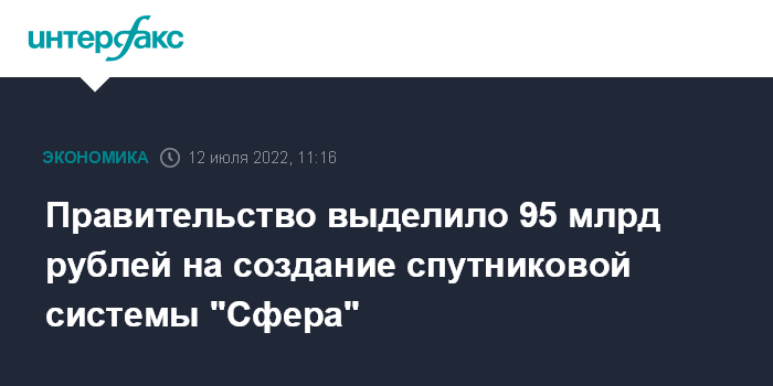 Москва. 12 июля. INTERFAX.RU - Правительство одобрило создание спутниковой системы "Сфера", на это выделено 95 млрд рублей, сообщил первый замгендиректора "Роскосмоса" Юрий Урличич. Об этом говорится в его презентации на саммите "Сильная Россия 2022".