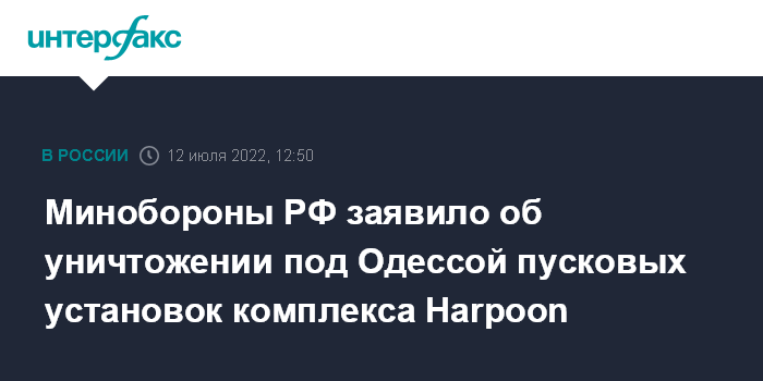 Москва. 12 июля. INTERFAX.RU - В Одесской области ракетами комплекса "Инскандер" уничтожены пусковые установки американского комплекса Harpoon, заявил официальный представитель Минобороны РФ Игорь Конашенков.