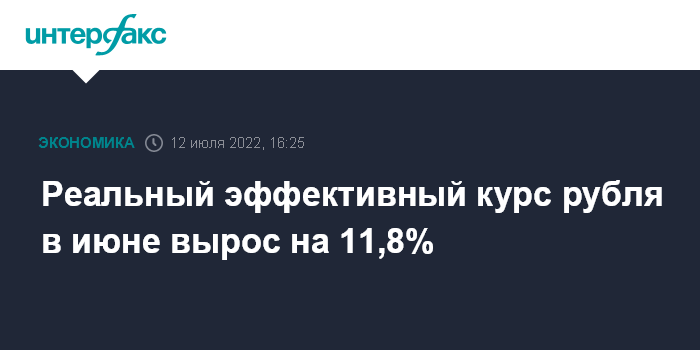 Москва. 12 июля. INTERFAX.RU - Реальный эффективный курс рубля к корзине валют государств - основных торговых партнеров России в июне 2022 года вырос на 11,8% по отношению к маю, согласно предварительной оценке ЦБ РФ, опубликованной на его сайте.