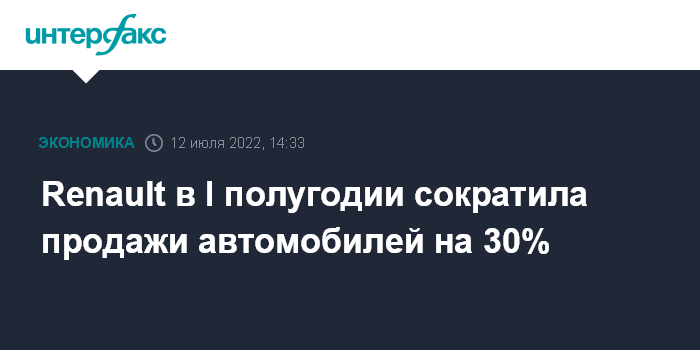 Москва. 12 июля. INTERFAX.RU - В первом полугодии 2022 года французский автомобилестроительный концерн Renault SA сократил продажи на 29,7% в годовом исчислении, до 1 000 199 штук из-за сохраняющегося дефицита полупроводников и ухода с российского рынка, сообщается в пресс-релизе компании.