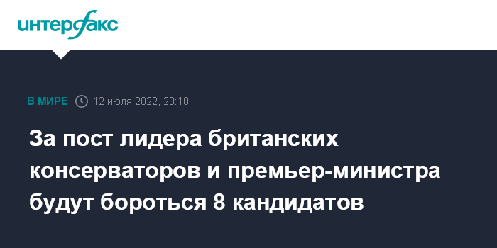Москва. 12 июля. INTERFAX.RU - Глава так называемого "комитета 1922" (парламентской группы от Консервативной партии в Палате общин Великобритании) сэр Грэм Брэди объявил полный список из восьми кандидатов на пост лидера Консервативной партии и, соответственно, премьер-министра страны, сообщает во вторник Sky News.