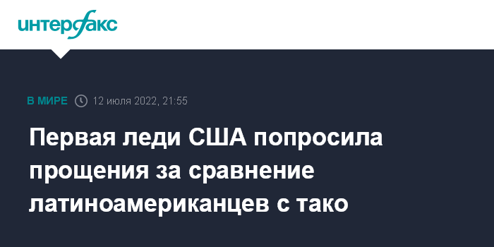 Москва. 12 июля. INTERFAX.RU - Первой леди США Джилл Байден пришлось просить прощения за неуместное сравнение латиноамериканцев с тако во время выступления перед латиноамериканской правозащитной организацией, сообщает во вторник Associated Press.