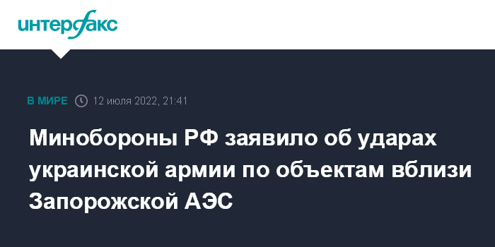 Москва. 12 июля. INTERFAX.RU - Министерство обороны России заявило, что армия Украины при помощи беспилотников нанесла удары по объектам рядом с Запорожской АЭС.