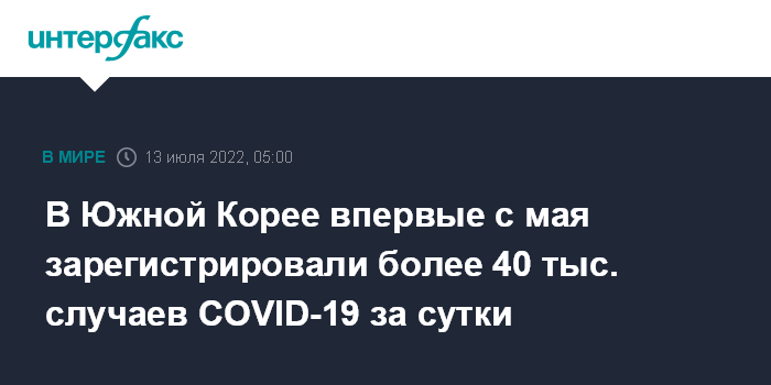 Москва. 13 июля. INTERFAX.RU - В Южной Корее заболеваемость коронавирусной инфекцией впервые за два месяца превысила 40 тыс. новых случаев за сутки, сообщает информагентство Yonhap.
