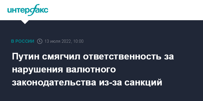 Москва. 13 июля. INTERFAX.RU - Президент Владимир Путин подписал закон, смягчающий административную ответственность за отдельные нарушения валютного законодательства, обусловленные санкциями против российских граждан и юридических лиц со стороны недружественных иностранных государств, сообщает сайт Кремля.