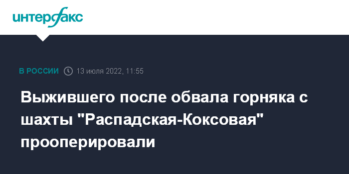 Москва. 13 июля. INTERFAX.RU - Шахтеру, которого шесть суток искали после обвала на шахте "Распадская-Коксовая" в Междуреченске, сделали первую операцию, он находится в реанимации в стабильном состоянии, сообщил директор шахты Александр Лукиных.