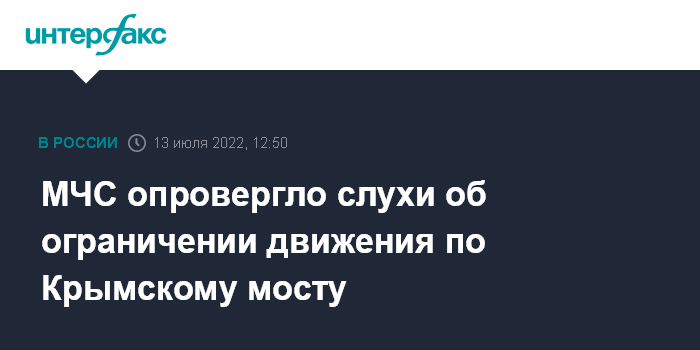 Москва. 13 июля. INTERFAX.RU - В управлении МЧС по Крыму назвали недостоверной информации об ограничении движения по Крымскому мосту, мост работает штатно.