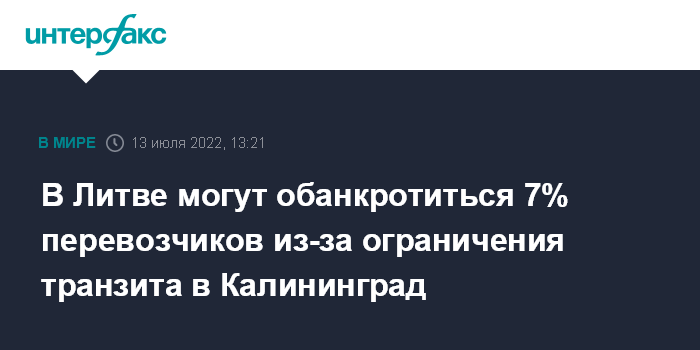 Москва. 13 июля. INTERFAX.RU - Ситуация с калининградским транзитом может привести к банкротству и уходу с транспортного рынка Литвы 5-7% местных перевозчиков, считает литовская национальная ассоциация автомобильных перевозчиков "Линава".