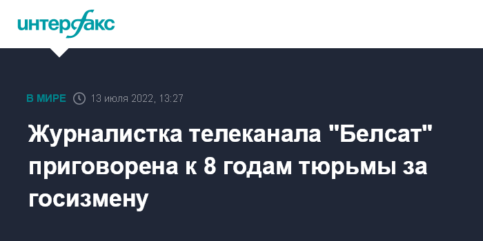 Москва. 13 июля. INTERFAX.RU - Гомельский областной суд приговорил к восьми годам лишения свободы журналистку телеканала "Белсат" Катерину Андрееву, сообщил правозащитный центр "Весна". Она признана виновной в госизмене (ч.1 ст. 356 УК Белоруссии).