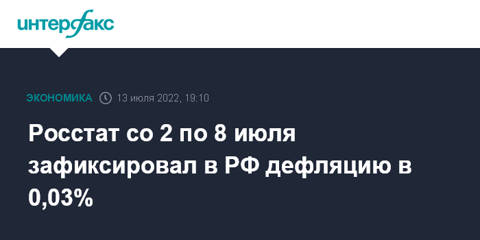 Москва. 13 июля. INTERFAX.RU - Росстат на неделе со 2 по 8 июля 2022 года зафиксировал в РФ дефляцию на уровне 0,03% после инфляции в 0,23% в "тарифную неделю" с 25 июня по 1 июля, нулевой инфляции с 18 по 24 июня и трех недель дефляции до этого (в 0,12%, 0,14% и 0,01%).