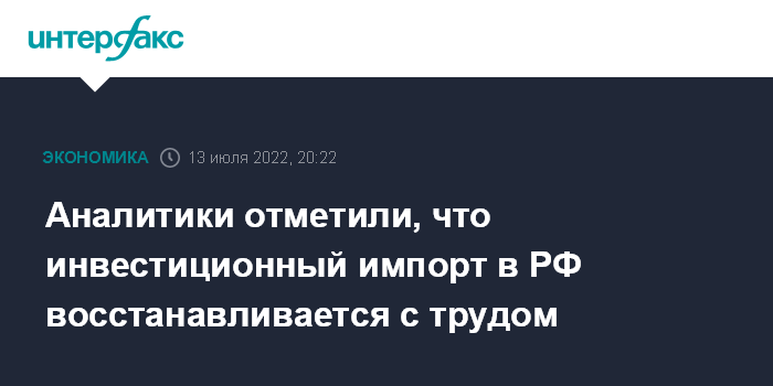 Москва. 13 июля. INTERFAX.RU - Импорт в РФ инвестиционных товаров, от доступности которых во многом зависят перспективы структурной перестройки экономики, пока восстанавливается с трудом, а внутренний рынок на данный момент не готов к полноценному замещению поставок из-за рубежа, пишут аналитики Банка России.