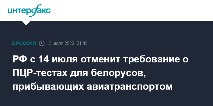 Москва. 13 июля. INTERFAX.RU - Россия с 14 июля отменяет требование о ПЦР-тестах для граждан Белоруссии, прибывающих авиатранспортом, это следует из постановления главного государственного санитарного врача РФ Анны Поповой, опубликованном в среду на официальном интернет-портале правовой информации.