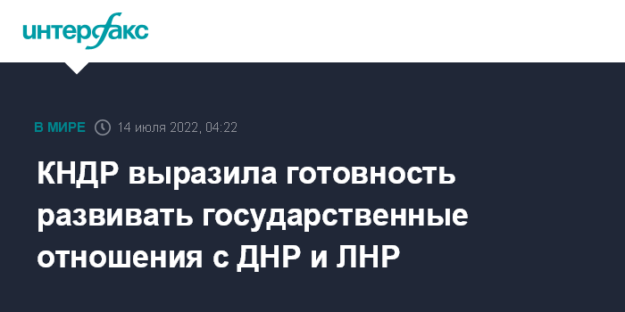 Москва. 14 июля. INTERFAX.RU - Пхеньян намерен развивать государственные отношения с Донецкой и Луганской народными республиками, сообщает ЦТАК.