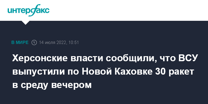 Москва. 14 июля. INTERFAX.RU - Украинские военные вечером в среду выпустили 30 ракет по территории города Новая Каховка в Херсонской области, большинство из которых были сбиты, сообщила в своем телеграм-канале заместитель главы временной администрации области Екатерина Губарева.