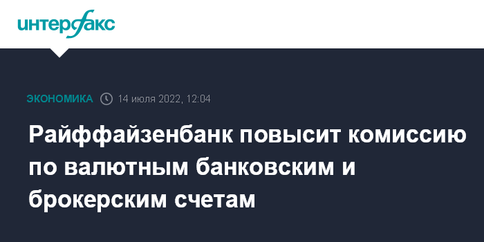 Москва. 14 июля. INTERFAX.RU - Райффайзенбанк с 31 июля 2022 года повысит комиссию за обслуживание валютных банковских и брокерских счетов. Об этом говорится в сообщении кредитной организации в ее официальном Telegram-канале.