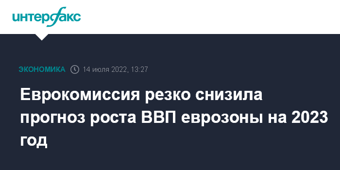 Москва. 14 июля. INTERFAX.RU - Европейская комиссия немного ухудшила прогноз роста ВВП еврозоны на 2022 год, при этом прогноз на 2023 год был существенно пересмотрен в сторону снижения.