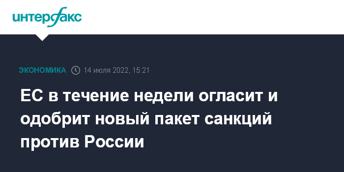 По данным дипломатов, постпреды ЕС 14 и 15 июля проведут встречи по подготовке к введению санкций. Источники отметили, что, вероятно, их могут одобрить к середине следующей недели.