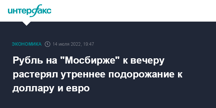 Москва. 14 июля. INTERFAX.RU - Курс рубля к бивалютной корзине не изменился по итогам торгов четверга на "Московской бирже" в условиях разнонаправленной динамики в основных валютных парах.