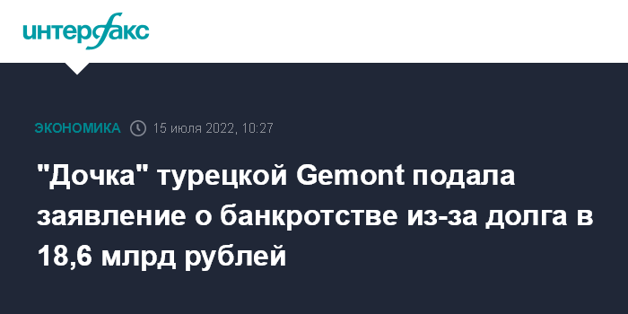 "Дочка" турецкой Gemont подала заявление о банкротстве из-за долга в 18,6 млрд рублей