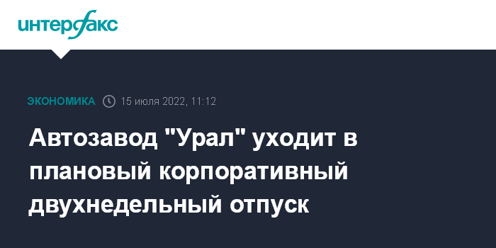 Москва. 15 июля. INTERFAX.RU - АО "Автомобильный завод "Урал" (Миасс, Челябинская область) уходит в плановый ежегодный корпоративный отпуск с 18 по 31 июля включительно, сообщили "Интерфаксу" в пресс-службе предприятия.