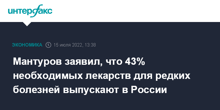 Москва. 15 июля. INTERFAX.RU - Более 43% потребности в лекарственных препаратах для редких заболеваний в России обеспечивается отечественными фармацевтическими компаниями, сообщил в Госдуме глава Минпромторга Денис Мантуров.