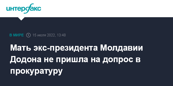 Москва. 15 июля. INTERFAX.RU - Мать бывшего президента Молдавии Игоря Додона - Галина Додон - не явилась в пятницу на допрос в прокуратуру, сославшись на плохое самочувствие, сообщила пресс-секретарь Генпрокуратуры страны Марианна Керпек.