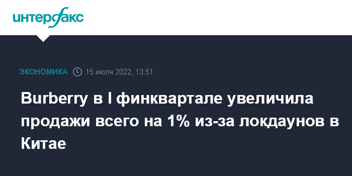 Москва. 15 июля. INTERFAX.RU - Один из ведущих мировых производителей товаров класса люкс Burberry Group Plc в первом финансовом квартале, который завершился 2 июля, увеличила сопоставимые продажи всего на 1% из-за локдаунов в Китае.