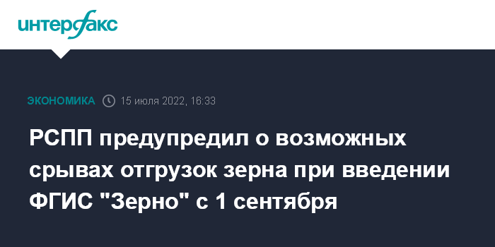 Москва. 15 июля. INTERFAX.RU - Российский союз промышленников и предпринимателей (РСПП) предупреждает о возможных остановках отгрузок зерна в случае введения с 1 сентября 2022 года федеральной государственной информационной системы (ФГИС) "Зерно".