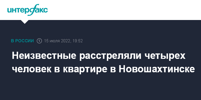 Москва. 15 июля. INTERFAX.RU - Полицейские устанавливают личность и местонахождение неизвестных, расстрелявших четырех человек в одной из квартир Новошахтинска в Ростовской области. Об этом сообщили "Интерфаксу" в пресс-службе ГУ МВД по региону.