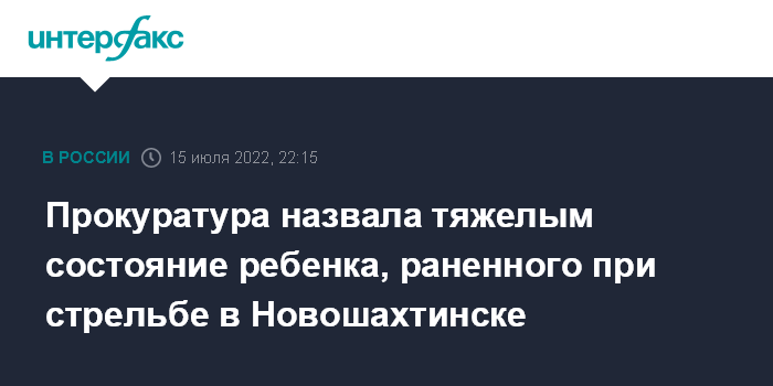 Москва. 15 июля. INTERFAX.RU - Раненый несовершеннолетний после нападения на семью в Новошахтинске Ростовской области в пятницу находится в реанимации, состояние ребенка оценивается как тяжелое, сообщает пресс-служба региональной прокуратуры.