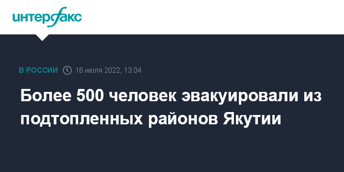 Москва. 16 июля. INTERFAX.RU - Число эвакуированных из подтопленных паводком районов Якутии в настоящее время превысило пятьсот человек, сообщается на странице в телеграм-канале МЧС РФ в субботу.