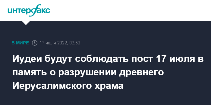 Москва. 17 июля. INTERFAX.RU - В это воскресенье иудеи всего мира будут соблюдать пост по случаю 17 тамуза (дата еврейского календаря): именно в этот день, как считается, в разные годы происходили трагические события еврейской истории.