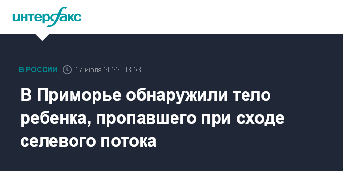 Москва. 17 июля. INTERFAX.RU - Спасатели обнаружили тело двухлетнего ребенка, поиски которого велись после схода селевого потока на два дома в Приморском крае, сообщает региональный главк МЧС России.