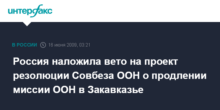 Лондон. 16 июня. INTERFAX.RU - Россия наложила вето на проект резолюции ООН о временном продлении мандата миссии ООН в Грузии и Абхазии, сообщает британская телерадиовещательная корпорация Би-би-си.