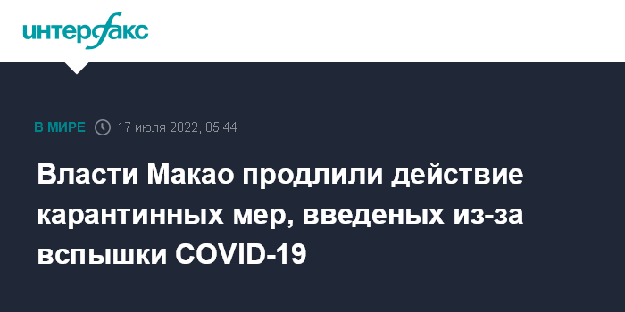 Москва. 17 июля. INTERFAX.RU - Власти специального административного района КНР Макао (Аомэнь) на пять дней продлили действие карантинных мер, введенных из-за вспышки COVID-19. Об этом пишет Associated Press.