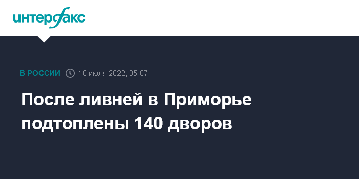 Москва. 18 июля. INTERFAX.RU - Последствия ливней ликвидируют в Приморье, где после ливневых дождей и повышения уровня воды в реках остаются подтопленными порядка 140 дворов, размыты дороги.