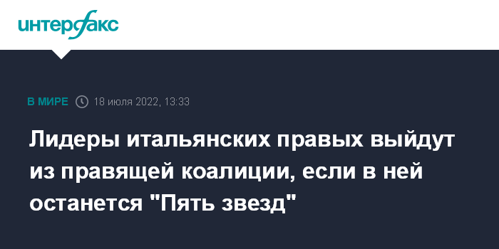 Москва. 18 июля. INTERFAX.RU - Лидеры двух ведущих итальянских правых партий "Вперед, Италия" и "Лига Севера" - Сильвио Берлускони и Маттео Сальвини договорились, что не останутся в правящей коалиции, если в ней продолжит работу популистское "Движение пять звезд", пишет газета Il Sole 24 Ore, ссылаясь на их совместное заявление.